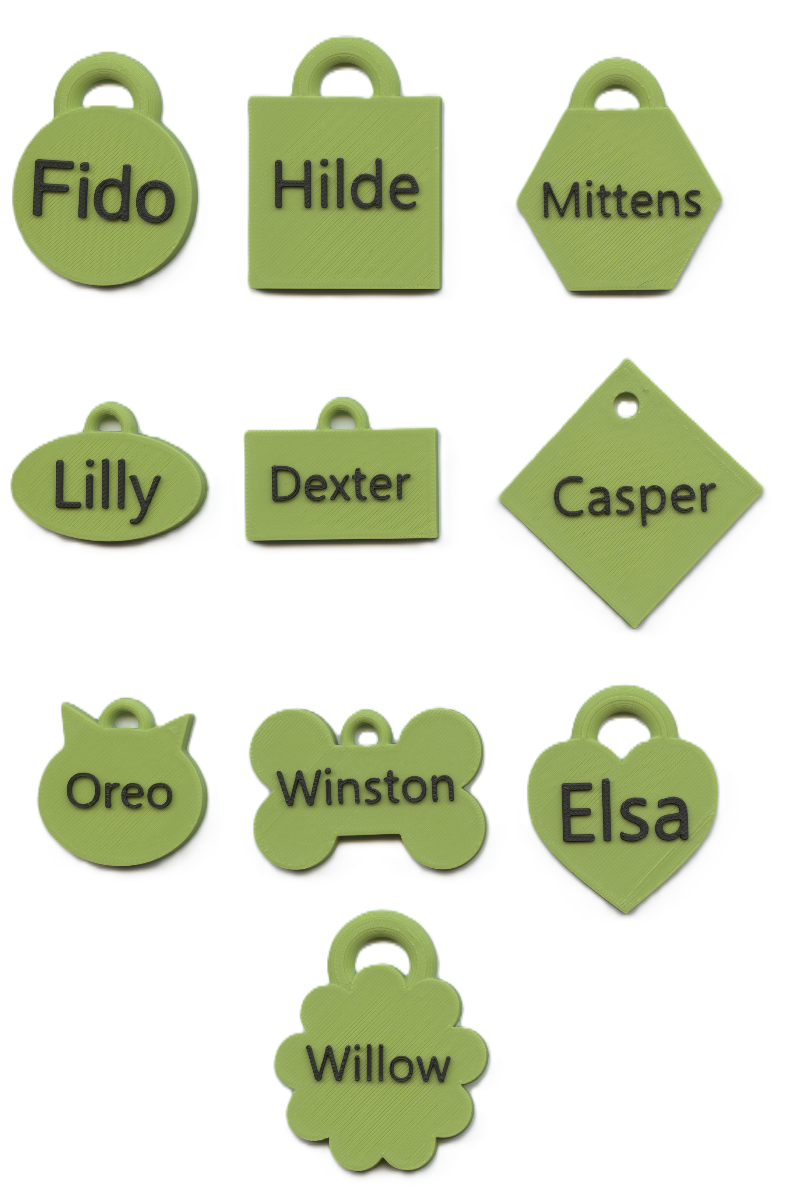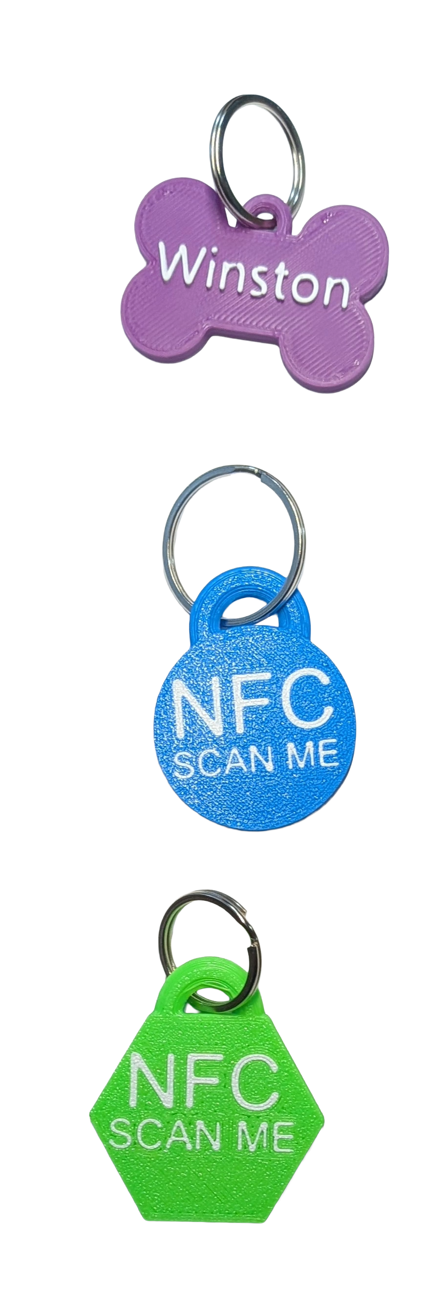 One side has your pet’s name; the other says "NFC SCAN Me" so people know to scan the tag.